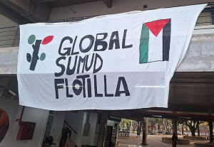 Image:  Banner with text "Global Sumud Flotilla" and images of a stylized olive tree and a Palestinian flag.   By Mtvdanilo, CC BY 4.0, via Wikimedia Commons, cropped.