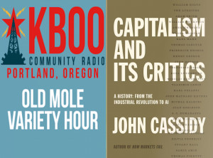Image: left side, logo for KBOO Community Radio Portland Oregon, Old Mole Variety Hour; right side, fair use cover of Capitalism and Its Critics A History: From the Industrial Revolution to AI by John Cassidy, author of How Markets Fail.